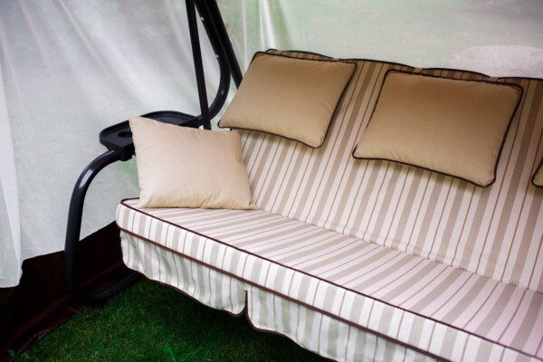 Мягкий элемент: ткань 40% п/э – 60% хлопок, наполнитель мягкого элемента айрофом 50мм+ поролон 30мм, наполнитель подушек — синтепон. Подушки на липучках – 3 шт. с окантовкой + 2 шт. обычные подушки.